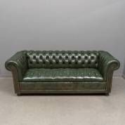 Groen lederen bank, Chesterfield-stijl, 20e eeuw -slijtage en deels later bijgekleurd met glimmende laag-, 69 × 185 × 80 cm
