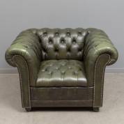 Groen lederen fauteuil, Chesterfield-stijl, 20e eeuw -slijtage-, 68 × 99 × 80 cm