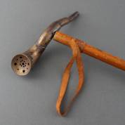 Malacca wandelstok met messing oorhoorn als greep, hoornen ring en ferrule, Duitsland, 19e eeuw, lengte 88 cm