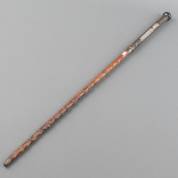 Knoestige houten wandelstok met thermometer in messing houder met zwarthouten knop en messing ferrule, 19e eeuw, lengte 90 cm