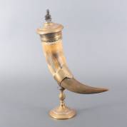 Buffelhoornen cornucopia met messing monturen en voet, de voet met inscriptie: 'ARES - Afd. Rotterdam der Nederlandsche Weerbaarheids Vereeniging.' -kleine defecten aan messing sierrandje-, 43 × 30 × 11 cm