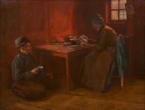Jules Benoit-Levy (1866-1952), Volendams echtpaar in interieur, olieverf op doek, l.o. gesigneerd, 49 × 63,5 cm