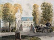 Hollandse School: ingang naar een buitenplaats, met aan de linkerzijde een theekoepel, aquarel op papier, niet gesigneerd, 19e eeuw -enkele verkleuringen en roestvlekjes, scheurtje links midden-, 43 × 58 cm