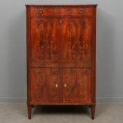 Mahoniegefineerde secretaire à abattant met geblokte biezen, de lades achter de deurtjes onderin met dubbele bodem, Louis Seize -één overhoeks profieltje ontbreekt rechtsonder, één paneel ontbreekt tussen interne laatjes, rozetje van klep ontbreekt-, 149 × 92 × 45 cm