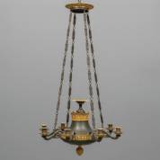 Verguld bronzen en gepatineerd messing achtlichts discusvormige kaarsenkroon, empire -ornament bovenop discus ontbreekt-, 110 × Ø 59 cm