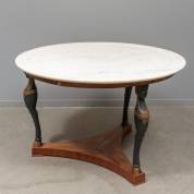 Ronde tafel met marmeren blad, gedragen door drie kariatiden, en mahonie frame, eerste helft 19e eeuw -ernstige fineerschade op houten ring onder blad, blad met enkele randchipjes-, 73 × 116 cm