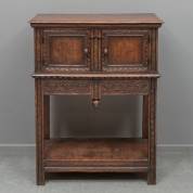 Eiken credenskastje met gesneden front waarin twee deurtjes en twee lades, renaissance-stijl, 19e eeuw, 108 × 84,5 × 41,5 cm