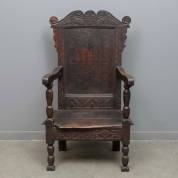 Eiken armstoel met gesneden rugleuning, Engeland, 18e eeuw -voorzijde van de zitting ontbreekt voor een deel-, met groen kussentje van later datum