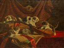 Cornelis Raaphorst (1875-1954), vijf spelende kittens op tafel met snaarinstrument, olieverf op doek, r.o. gesigneerd -klein stukje verfverlies r.o. en l.b.-, 60 × 80 cm