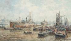 Gerard Johannes Delfgaauw (1882-1947), havengezicht Rotterdam, olieverf op doek, r.o. gesigneerd en gedateerd '37 -verfverlies aan linkerzijde-, 59 × 99 cm
