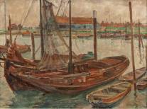 Jan Korthals (1916-1972), botters in de haven, marouflé, l.o. gesigneerd, 29 × 39 cm