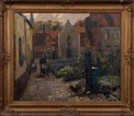 Henriette Marcus (1891-1993), gezicht op een binnentuin met pomp en spinnende vrouw, olieverf op doek, l.o. gesigneerd, 50 × 60 cm
