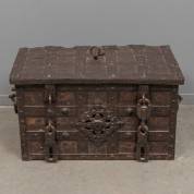 Smeedijzeren geldkist met slot in de klep, de voorkant met bladvormige fopslotplaat, Duitsland, 17e eeuw, 47 × 83 × 53 cm