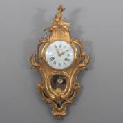 Verguld bronzen cartelklok met geëmailleerde wijzerplaat, gesigneerd Courvoisier à Paris, slagwerk op bel, Frankrijk, 18e eeuw -lichte gebruikssporen aan wijzerplaat-, 54 × 29 × 10 cm, inclusief slinger en opwindsleutel
