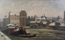 David Schulman (1881-1966), winters gezicht op pakhuizen op het Realeneiland te Amsterdam, olieverf op doek, r.o. gesigneerd, 59 × 91 cm