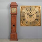 Amsterdams staand horloge in notenhouten kast, de wijzerplaat met maanstand, dag- en datumaanduiding, de hoeken versierd met de vier jaargetijden, gesigneerd Hendrik van Eyk, circa 1740 -kleine defecten en gebruikssporen-, 245 × 50 × 28 cm