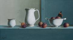 Leo Pors (1952), stilleven met vlinder, pruimen en wit aardewerk, olieverf op paneel, l.o. gesigneerd en gedateerd 2008, 25 × 45 cm -volgrecht van toepassing-