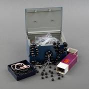 Kistje met diverse kralen waaronder: granaat, git en bloedkoraal, en 14kt gouden kapittelslotje