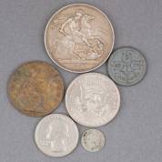 Zes diverse munten, waaronder: Britse zilveren 'Jubilee Head' Crown-munt, 1890, met op de keerzijde Sint-Joris en de Draak