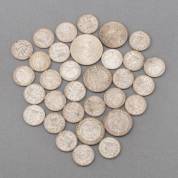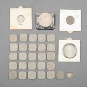 26 vierkante Nederlandse 5-centen, nikkel, circa 1920, twee 10-cent, 1937 en 1939, 1-cent 1937, zilveren 50-schilling, 1967 en zilveren 2-schilling, 1932, gewicht zilver 30 gram