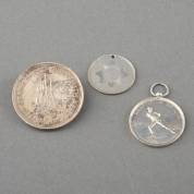 Drie diverse zilveren munten en penningen, bestaande uit: tot broche vermaakte Zuid-Afrikaanse 5 shilling herdenkingsmunt van 300 jaar stichting Kaapstad 1652-1952 -speld onedel-, zilveren prijspenning Delftsche IJsclub en Vrijmetselarijpenning met inscriptie 'A.M. van Citters' en gedateerd 1819, brutogewicht 48 gram, munt Ø 3,8 cm