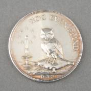Zilveren penning: spotpenning met afbeelding van een uil op kussen waaronder een zwaard naast brandende kaars met tekst: 'NOG EVEN BLIND', verso met afbeelding van weegschaal met Bijbel tegen een mijter met staf en boeken met tekst: 'TEKEL', gemonogrammeerd DSS, Hollands, 1688, gewicht 49,4 gram, Ø 4.8 cm, deze penning verwijst naar James II en de zeven Bischoppen, naar aanleiding van de gevangenneming en veroordeling van zeven Engelse bisschoppen