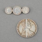 Zilveren thaler: Archid Avst Dux Burg Co Tyr, Theresia, Oostenrijk, 1780, daarbij: broche gemaakt van onedele speld met drie zilveren Wilhelmina-munten: één 25 cent, en tweemaal 10 cent, brutogewicht 35,8 gram, thaler Ø 4 cm