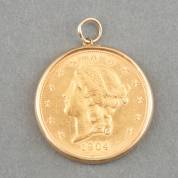 Gouden 20-Dollar, Verenigde Staten, 1904, in 14kt gouden montuur, gewicht 36,6 gram, Ø 3,5 cm, in cassette -onedel verbindingsoog-