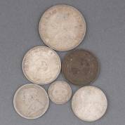 Zes deels zilveren Zuid-Afrikaanse munten: 5-shillings, 1892, 2,5 shillings, 1897, twee 2-shillings, 1895 en 1896, 1 penny, 1893, en 6-pence, 1897, gewicht zilver 64 gram