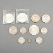 11 zilveren munten, Nederland en Curaçao, twee in plastic hoesje, brutogewicht 150 gram, 10 gulden Ø 3,7 cm