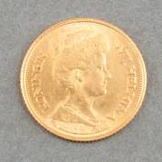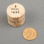 Gouden tientje, Wilhelmina, 1912, gewicht 6,7 gram, Ø 2,2 cm, in metalen blikje met tekst: 'voor het huishouden van G en E 5 juni 1935'
