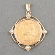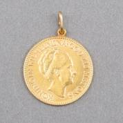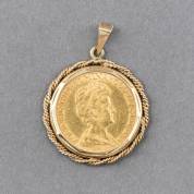Gouden tientje, Wilhelmina hangend haar, 1897, in montuur met drie zaadpareltjes en één diamantje in oud slijpsel, brutogewicht 10,2 gram, 4,3 ×cm
