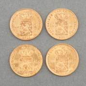 Vier gouden tientjes, Willem III, 1875 en 1876, gewicht 26,8 gram, Ø 2,2 cm