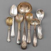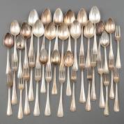 Diverse 2e gehalte zilveren bestekdelen, veelal Haags lof en enkele Hollands glad; twaalf dinerlepels, negen dinervorken, negen dessertlepels, en acht dessertvorken, diverse meesters en jaren, gewicht 2076 gram -enkele met monogram-
