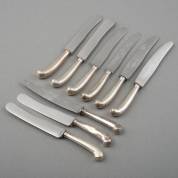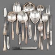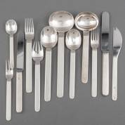 Twaalfpersoons 2e gehalte zilveren bestek, model 400 door Gustav Beran, meester: Van Kempen & Begeer, veelal 1966, bestaande uit: dinercouverts, dinermessen, dessertcouverts, dessertmessen, taartvorkjes, en zestiendelig diencouvert, bestaande uit: soepdienlepel, twee groentelepels, aardappellepel, vlalepel, twee sauslepels, rijstlepel, vleesvork, vier vleesvorkjes, twee botermesjes en een sinaasappelmesje, gewicht zonder messen 3591 gram, brutogewicht messen 1764 gram -gebruikssporen, messen met defecten, één dessertvork mist en is aangevuld met een dessertvork Haags lof-