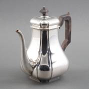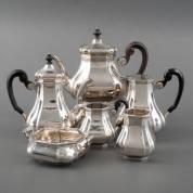 Zesdelig 2e gehalte zilveren koffie- en theeservies, model kardinaal, bestaande uit: koffiepot, theepot, warme melkkan, roomkan, suikerpot en lepelvaasje, voornamelijk meester: Zilverfabriek Voorschoten, 1918-1938, brutogewicht 1547 gram