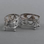 Paar zilveren houders voor zoutvaatjes met ajourgezaagd guirlandedecor, meester: René Pierre Ferrier, Parijs of mogelijk Orleans, laatste kwart 18e eeuw, gewicht 88 gram, 4,5 × 8 × 5 cm -beide gemonogrammeerd JH, zonder glazen binnenbakjes, één met uitgescheurd deel aan korte zijde-