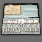 Gezwart houten lepeldoosje ingelegd met spiegel en velours, met slot en sleuteltje, waarin: twaalf 2e gehalte zilveren theelepels, theeduimpje en suikerschepje, alle met fijn gegraveerd kruisjesdecor, gewicht zilver 113,6 gram, doos circa 4,5 × 18 × 19 cm -deksel mist enkele biezen-