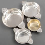 Set van vier zilveren kommen in oplopende grootte, alle met palmetvormige grepen, de grootste en kleinste 3e gehalte zilver, onduidelijk keur: vogel en sleutel, mogelijk Genève, beide met asymmetrische palmet, de kleinste kom bovendien met vermeil binnenzijde; de twee middelste kommen 2e gehalte zilver, onduidelijk keur: wapenschild met keper en daaromheen drie koeken, vermoedelijk Zwitserland, beide met symmetrische palmet; gewicht 3e gehalte 713 gram, gewicht 2e gehalte 655 gram, grootste kom 6 × Ø 20 cm