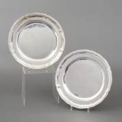Paar ronde 3e gehalte zilveren dienschalen met gecontourneerde en geprofileerde rand, Servië, 20e eeuw, gewicht 1963 gram, Ø 34,5 cm