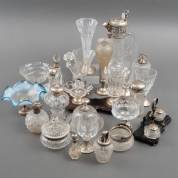 Divers kristal met veelal 2e gehalte zilveren monturen, waaronder inktstel, diverse schaaltjes, vaasjes, coupes en strooiers, maar ook karaf met verzilverde klepdeksel gedecoreerd met Bacchus en musicerende bacchantjes, karaf 24 cm hoog -gebruikssporen-
