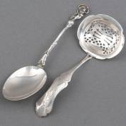 2e gehalte zilveren strooilepel met fijn gegraveerde steel, meester: Gerrit & Frederik van Geelen, Schoonhoven, 1874, daarbij: 2e gehalte zilveren gelegenheidslepel, de steel bekroond met dame, meester: G.J. Kok, Heerde, 1882, gewicht 59 gram