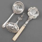 2e gehalte zilveren strooilepel met benen heft, meester: Jan Abraham Lintveld, Amsterdam, 1852 -benen heft gebarsten-, 1e gehalte zilveren natfruitschep, rondfilet, verso gemonogrammeerd, meester: Carl Bonebakker, Amsterdam, 1930, en zilveren natfruitschep gedecoreerd met mascaron en putto op de steel, Amsterdam, 18e eeuw -restauratie aan steel-, brutogewicht 171 gram, strooilepel 20 cm