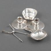 Paar 1e gehalte zilveren tafelkandelaartjes ontwerp Harald Nielsen, 1915-1919, en een suikertang, alle drie meester: Georg Jensen, Denemarken, daarbij: 1e gehalte zilveren theezeefje op lekbakje, kandelaar 3 × 6,5 cm, gewicht 194 gram