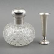 Grote kristallen flacon met ruitslijpsel en 1e gehalte zilveren montuur en dop, Londen, 1881, 1e gehalte zilveren vaasje op voet, Chester, flacon 17 × Ø 15 cm -flacon heeft deuk in de dop-