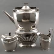 1e gehalte zilveren bouilloire, het komfoor met ajourgezaagd spijlendecor, het geheel gedecoreerd met parelranden, meester: Jan Buysen, Amsterdam, 1805, winkeliersmerk: Diemont, brutogewicht ketel 1106 gram, komfoor 677 gram, afmeting circa 40 × 28 × 16 cm, daarbij: bijpassende melkkan en theebus, beide meester: Pierre Hyacinthe la Ruelle, Amsterdam, 1807, brutogewicht samen 501 gram, herkomst: Juwelier Antiquair Premsela & Hamburger, Amsterdam