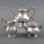 Driedelig 2e gehalte zilveren theeservies met rozendecor, meester: Koninklijke Utrechtse Fabriek van Zilverwerken C.J. Begeer, Utrecht, 1891, gewicht 900 gram, hoogte 16 cm