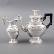 3e gehalte zilveren theepot en bijbehorende roomkan, de theepot met adelaar op het deksel, de tuit uitlopend in de vorm van een dierenkop, en de buik met een reliëfband van griffioenen en palmetbladeren, Posen, Duitsland, brutogewicht 832 gram, hoogte theepot 20 cm -lichte gebruikssporen-