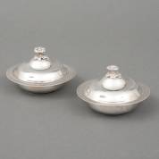 Paar 2e gehalte zilveren dekschaaltjes met gegraveerde palmetband en bloemvormige knop, Egypte, 20e eeuw, gewicht 289 gram 8 × Ø 12,5 cm -één gegraveerde rand wat sleets-