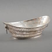 2e gehalte zilveren broodmand met opengewerkt decor en twee ringvormige greepjes met leeuwenkop, gewicht 368 gram, 9 × 28 × 17,5 cm -één ring defect-